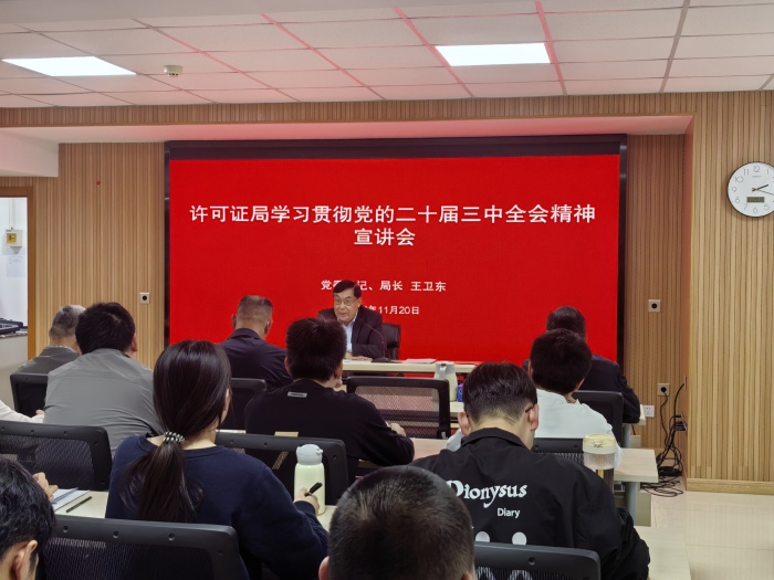 11月20日下午,许可证局举办学习贯彻党的二十届三中全会精神宣讲会,党委书记、局长王卫东宣讲党的二十届三中全会精神。许可证局全体党员、干部参加会议。